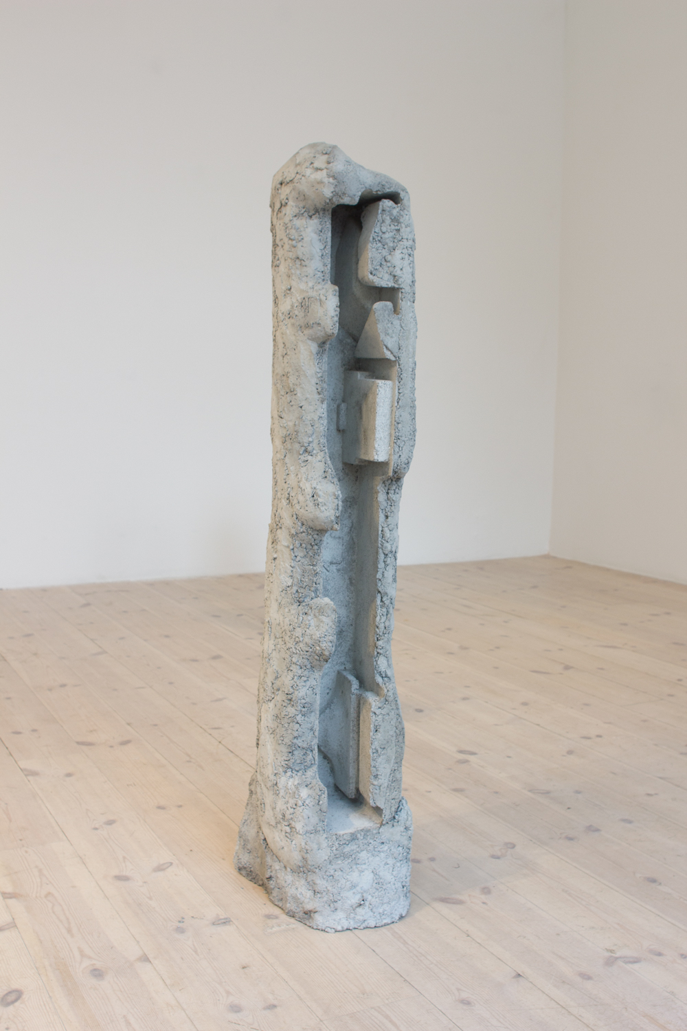 She has created her symbols from objects that she has found. They almost appear to her as the world does to some mystics, who can see, that the world is written in a magnificently subtle and avoiding language. But the material she has found shows that our language, in reality, is not magnificent: we have created the logograms by opening and throwing out the packaging in order to use the products. The French movement Nouveau Réalism often used similar material to give us a sober picture of what our culture actually is. I can imagine, that in Retzlaffs case, it has less to do with actual culture than the thinking and the production of ideas today. Creativity is not creating ideas, it hits me, but rather the system, that through its broken, thrown out semi objects, portray imaginative bi-products that we don’t really manage to reach. The dystopian is emphasised since the molds look like they are encapsulated by concrete, in a way, that makes one think about the handling of nuclear waste. Is it imaginative waste we are contemplating here? Or is it a symbol for thoughts about care (packaging) that have been abused?
